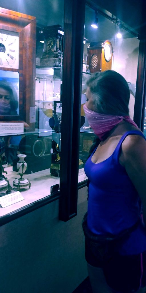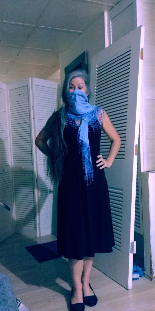 For health reasons and full awareness of the science, Barbara could not wear a mask, and had to play the game to keep a job by using her scarf collection to comply with C19 mask tyranny, it became a fashion statement.